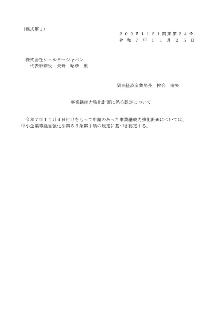 株式会社シェルタージャパンは、経済産業省が推進する「事業継続力強化計画(BCP)」について、2026年1月から2028年12月までの3年間、継続認定を受けました。